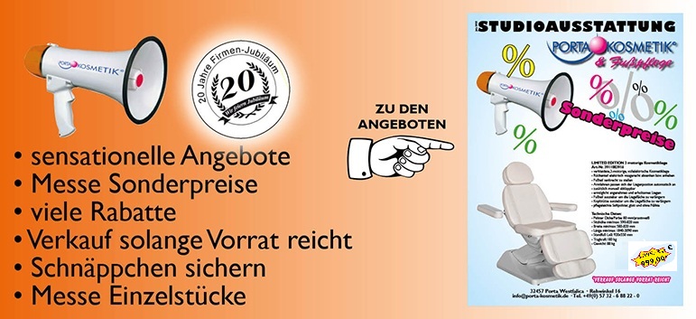 Ganz gleich, ob Sie als Freiberufler in den Bereichen Massage, Nageldesign oder Fußpflege tätig sind, ein Hotel mit Wellness betreiben oder als Händler selbst Kosmetikprodukte verkaufen, ob Sie ein einzelnes Gerät erwerben oder ein komplettes Studio einrichten möchten: Im Online Shop von Porta-Kosmetik.de finden Sie immer die besten Produkte für Ihr Geschäft und Anliegen.